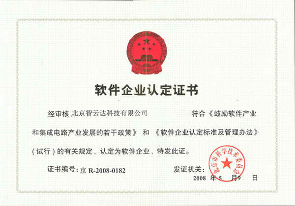 北京智云達(dá)軟件企業(yè)認(rèn)證證書