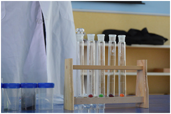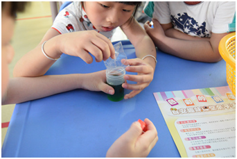 實(shí)驗(yàn)課的開(kāi)頭,林老師拿出提前準(zhǔn)備好的試管,里面加了兩個(gè)神秘的糖豆,讓小朋友在試管中加入水,搖晃幾下,只見(jiàn)水的顏色也從原來(lái)的透明變成了糖豆的顏色,小盆友們都瞪大了眼睛并且看的津津有味,還不時(shí)露出驚訝的表情。
