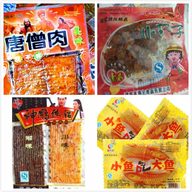 那時(shí)候的辣條也知道借熱點(diǎn)營(yíng)銷,所以命名也總是緊跟潮流,什么“唐僧肉、小丸子、神雕俠侶”就統(tǒng)統(tǒng)跑出來(lái)了!就連小魚吃大魚的電影也被拿來(lái)命名了呢!