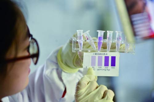 在1.5ml離心管中先滴加2滴檢測(cè)液A,1滴檢測(cè)液B,上下?lián)u動(dòng),混勻;然后加入1ml樣品液,立即蓋蓋混勻。放置5分鐘觀察顏色變化,并與色卡對(duì)照,得出樣品中二氧化硫或亞硫酸鹽是否超標(biāo)的信息。
