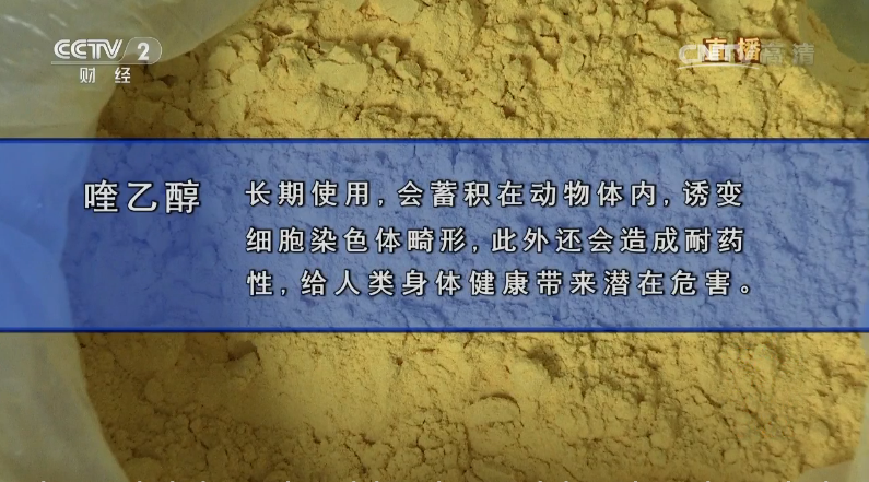 喹乙醇:一種黃色粉末,動物長期食用,會蓄積在動物體內,誘變細胞染色體畸形。此外還會造成耐藥性,給人類身體健康帶來潛在危害。因此,我國2005年版《獸藥典》以及《飼料藥物添加劑使用規范》都明確規定,喹乙醇適用范圍:35公斤以下的豬,禁用于禽、禁用于體重超過35kg的豬、休藥期35天。
