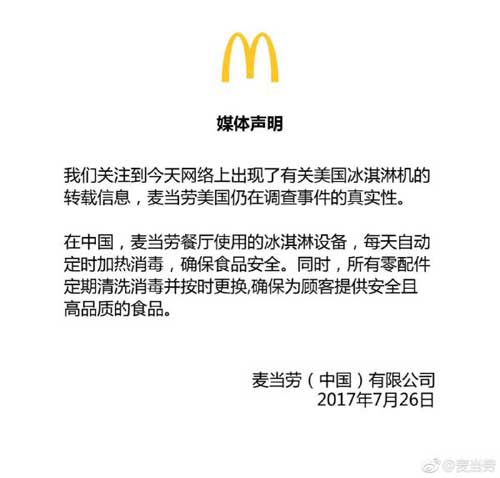 7月26日23時(shí)許,麥當(dāng)勞官方微博發(fā)布了《關(guān)于美國(guó)冰淇淋機(jī)的媒體聲明》:“我們關(guān)注到今天網(wǎng)絡(luò)上出現(xiàn)了有關(guān)美國(guó)冰淇淋機(jī)的轉(zhuǎn)載信息,麥當(dāng)勞美國(guó)仍在調(diào)查事件的真實(shí)性。在中國(guó),麥當(dāng)勞餐廳使用的冰淇淋設(shè)備,每天自動(dòng)定時(shí)加熱消毒,確保食品安全。同時(shí),所有零配件定期清洗消毒并按時(shí)更換,確保為顧客提供安全且高品質(zhì)的食品?!?