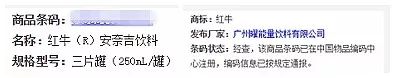 經(jīng)過快速消費(fèi)品精英俱樂部的多方調(diào)查,所有信息都指向了廣州曜能量飲料有限公司,而我們通過掃描罐體上的條形碼,淘寶顯示出來的是2015年曜能量功能飲料復(fù)仇者聯(lián)盟2收藏紀(jì)念限量套罐。在中國物品編碼中心條碼則顯示為紅牛 安奈吉飲料,發(fā)布廠商也為廣州曜能量飲料有限公司。