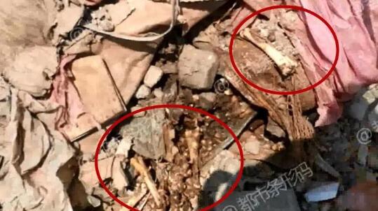 圖片上的這些肉,是有人從垃圾填埋場里三、四米的深坑里刨出來的,腐爛的雞腳、雞翅、牛肉、散發(fā)著腐臭味,這些肉從哪兒來,將到哪去?