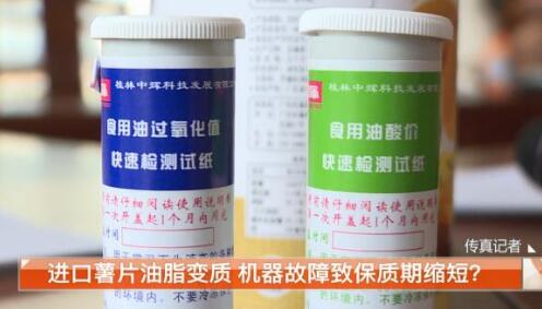 記者找到了專業(yè)的檢測(cè)人員,對(duì)薯片里的油進(jìn)行酸價(jià)和過氧化值的檢測(cè)。經(jīng)檢測(cè),這款薯片里油脂的酸價(jià)和過氧化值均超過了正常范圍,證明薯片使用的植物油已經(jīng)酸敗。
