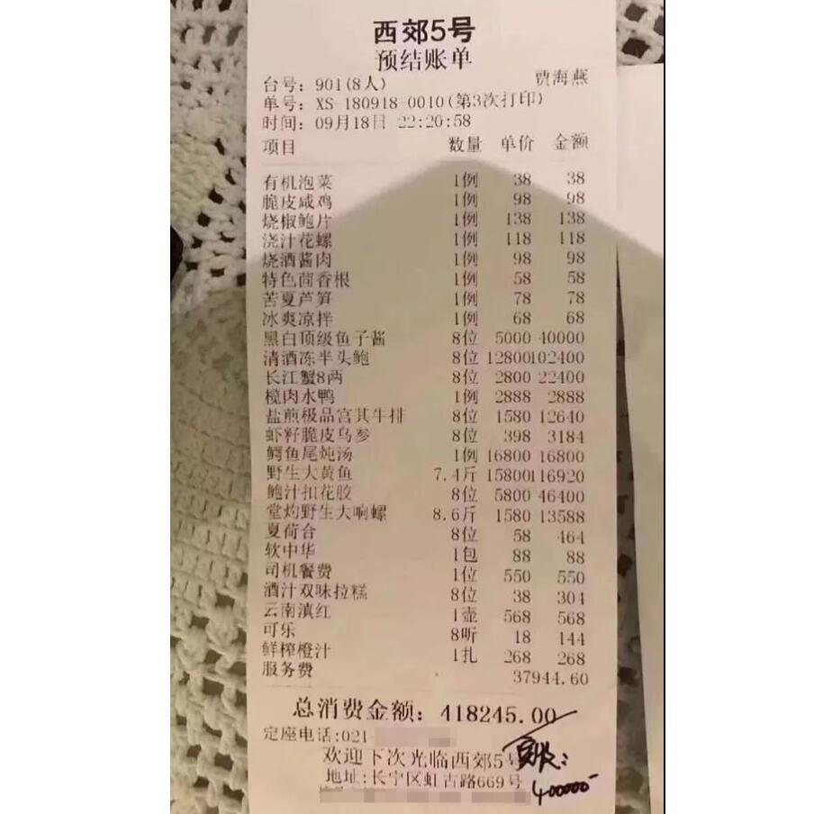 菜單中,另包含550元的司機餐,以及將近3.8萬元的服務(wù)費,總價共計418245元,賬單右下角有手寫標(biāo)注“實收”40萬元。