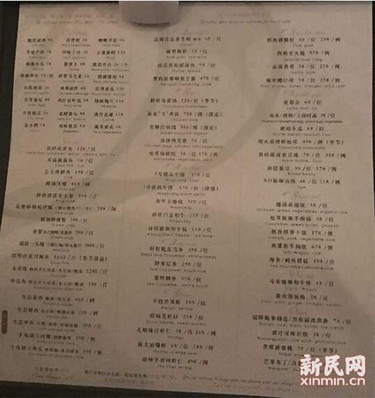 新民晚報新民網(wǎng)記者在店里看到一份菜單,網(wǎng)傳“天價賬單”上“清酒凍半頭鮑”、“黑白頂級魚子醬”等幾個單價較貴的菜品在菜單上均無銷售,菜單上最貴的菜品為“超級一頭鮑”價格為3800元/只。