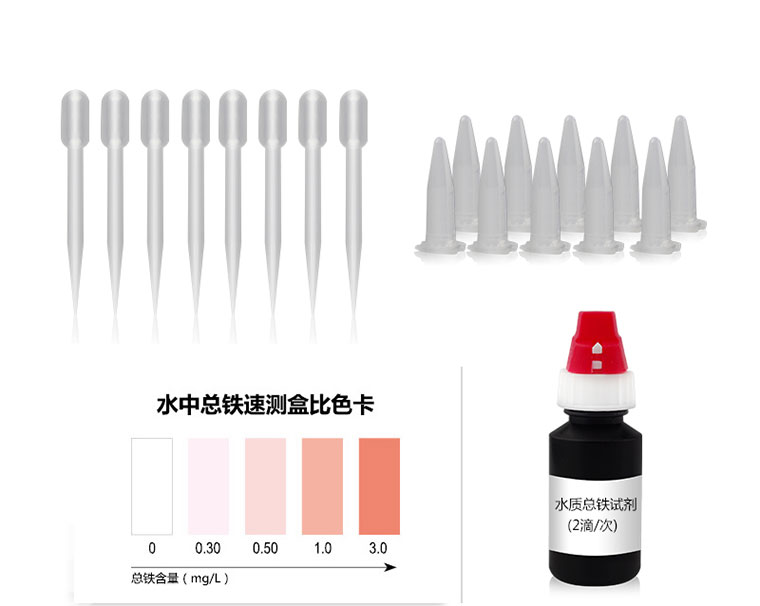 水中鐵離子與檢測(cè)試劑反應(yīng)生成橙紅色物質(zhì),含量越高顯色越深。