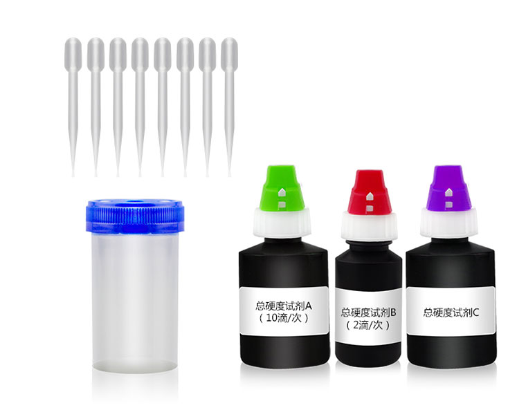 取5ml水樣于50mL塑料瓶中,加入10滴總硬度試劑A,加入2滴總硬度試劑B,搖勻,用總硬度試劑C直立式滴定,邊滴定邊搖動(dòng),滴至水樣由紫紅突變?yōu)樗{(lán)色為止,記錄總硬度試劑C所消耗的滴數(shù),同時(shí)用純凈水做一空白滴定,用樣品消耗總硬度試劑C滴數(shù)減去空白消耗滴數(shù)后乘以25即為水樣總硬度mg/L(以CaCO3計(jì))。