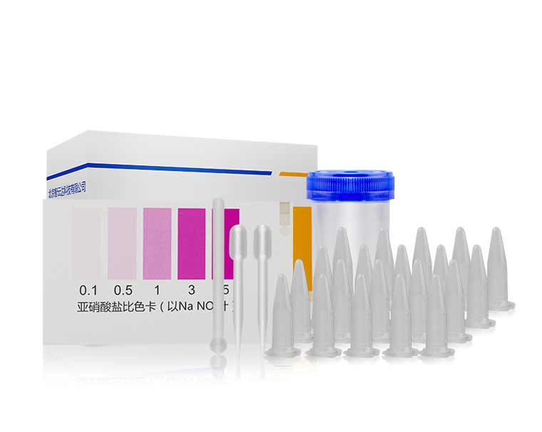 食品中的亞硝酸鹽與試劑反應生成紫紅色特殊物質,通過與比色卡對比,可判定樣品中亞硝酸鹽是否超標。
