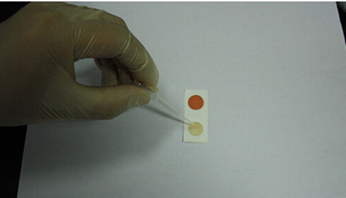 2、 取出農(nóng)藥殘留快速檢測卡,用滴管吸取2-3滴提取液,將提取液液滴加入到農(nóng)殘卡白色要片上。