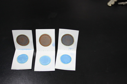打開后的農(nóng)殘卡卡片白色藥片初變?yōu)樘焖{(lán)色。
