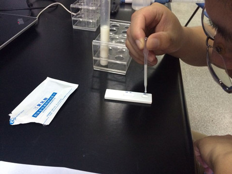 3、吸取待測樣品溶液,緩慢滴加80~100μl(約3~4滴)樣品液于加樣孔中,開始計時,在3~5分鐘內讀取結果。
