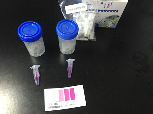 取上清液1.0ml加入到速測管中,蓋上蓋,將試劑搖溶,10分鐘后與標(biāo)準(zhǔn)比色卡對比,該比色卡上的數(shù)值乘上10即為樣品中亞硝酸鹽的含量mg/ kg;