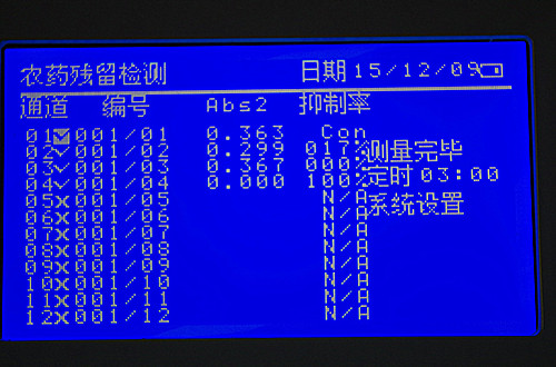 檢測(cè)結(jié)果如圖所示,結(jié)果以酶被抑制的程度,即抑制率表示。當(dāng)果蔬樣品提取液對(duì)酶的抑制率為40~50%時(shí),則表明被測(cè)樣品為可疑農(nóng)殘超標(biāo)樣品;當(dāng)抑制率≥50%時(shí),表示蔬菜中有高劑量有機(jī)磷或氨基甲酸酯類農(nóng)藥存在,樣品為陽性結(jié)果。