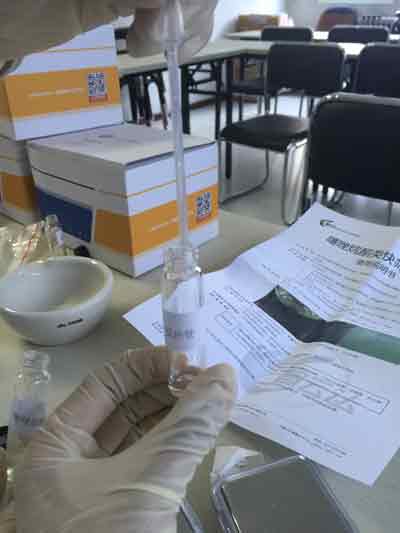 上下顛倒混勻約30秒,靜置。用0.5mL塑料吸管吸取上層樣品處理液,放于反應(yīng)管中,滴加3-5滴試劑C,靜置觀察結(jié)果。