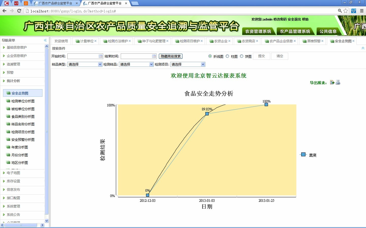 1.1檢測數(shù)據(jù)預警 、安全走勢分析統(tǒng)計 、檢測單位分析統(tǒng)計 、被檢單位分析統(tǒng)計 、產品類別分析統(tǒng)計、專項產品分析統(tǒng)計、專項項目分析統(tǒng)計、指令預警分析統(tǒng)計、省內年度分析統(tǒng)計、省內月份分析統(tǒng)計、監(jiān)管地區(qū)分析統(tǒng)計、同期比對分析統(tǒng)計等統(tǒng)計功能。安全走勢統(tǒng)計功能如圖1-1所示