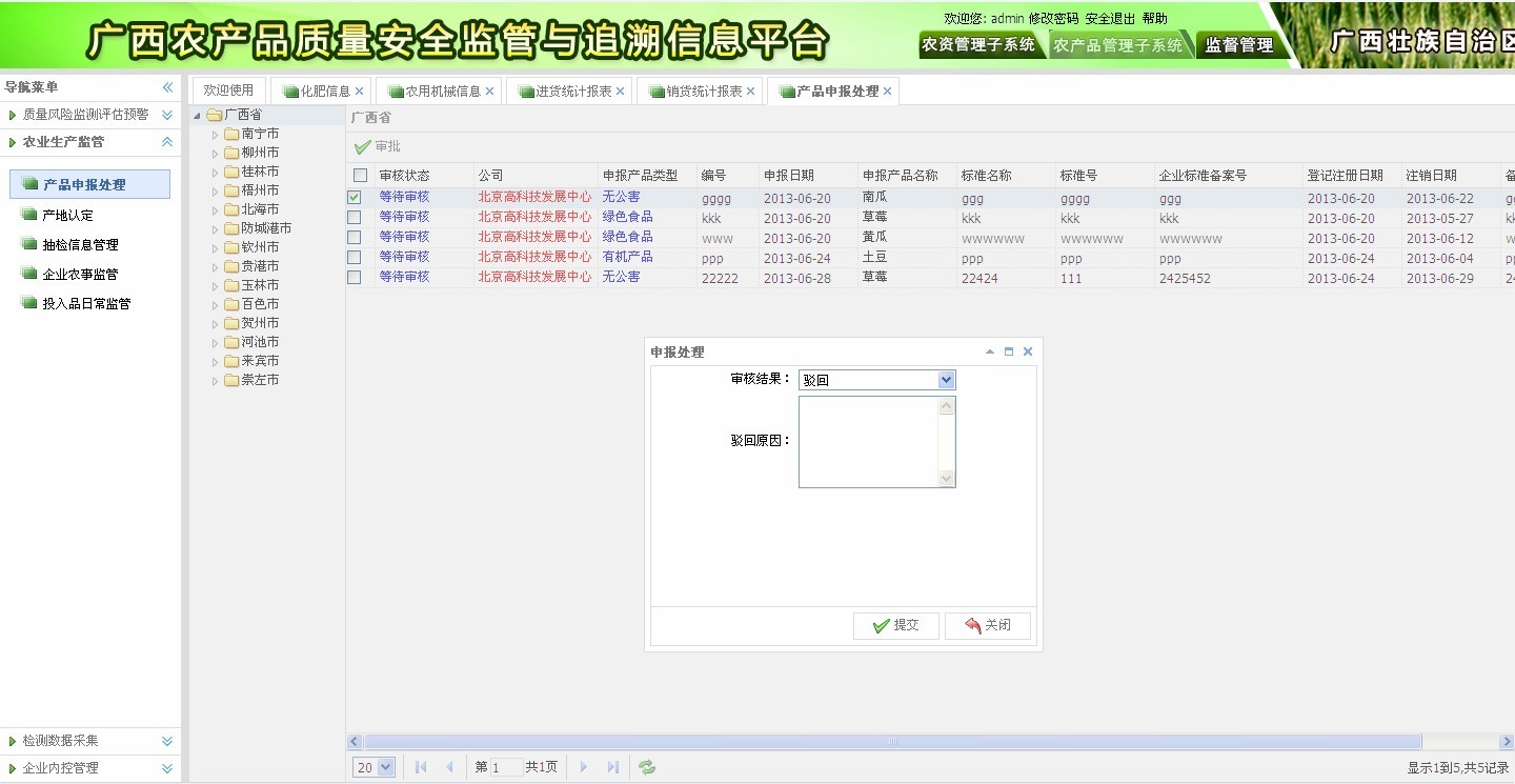 監(jiān)管部門負責處理三品產品的認證審核。審批結果包括通過和駁回,如此申報駁回需填寫駁回原因。如圖2-1所示