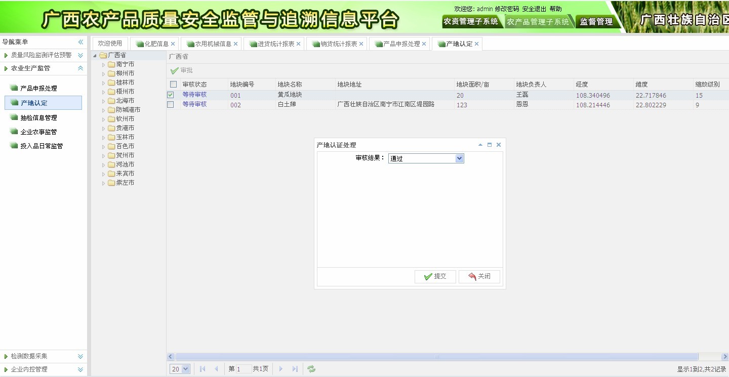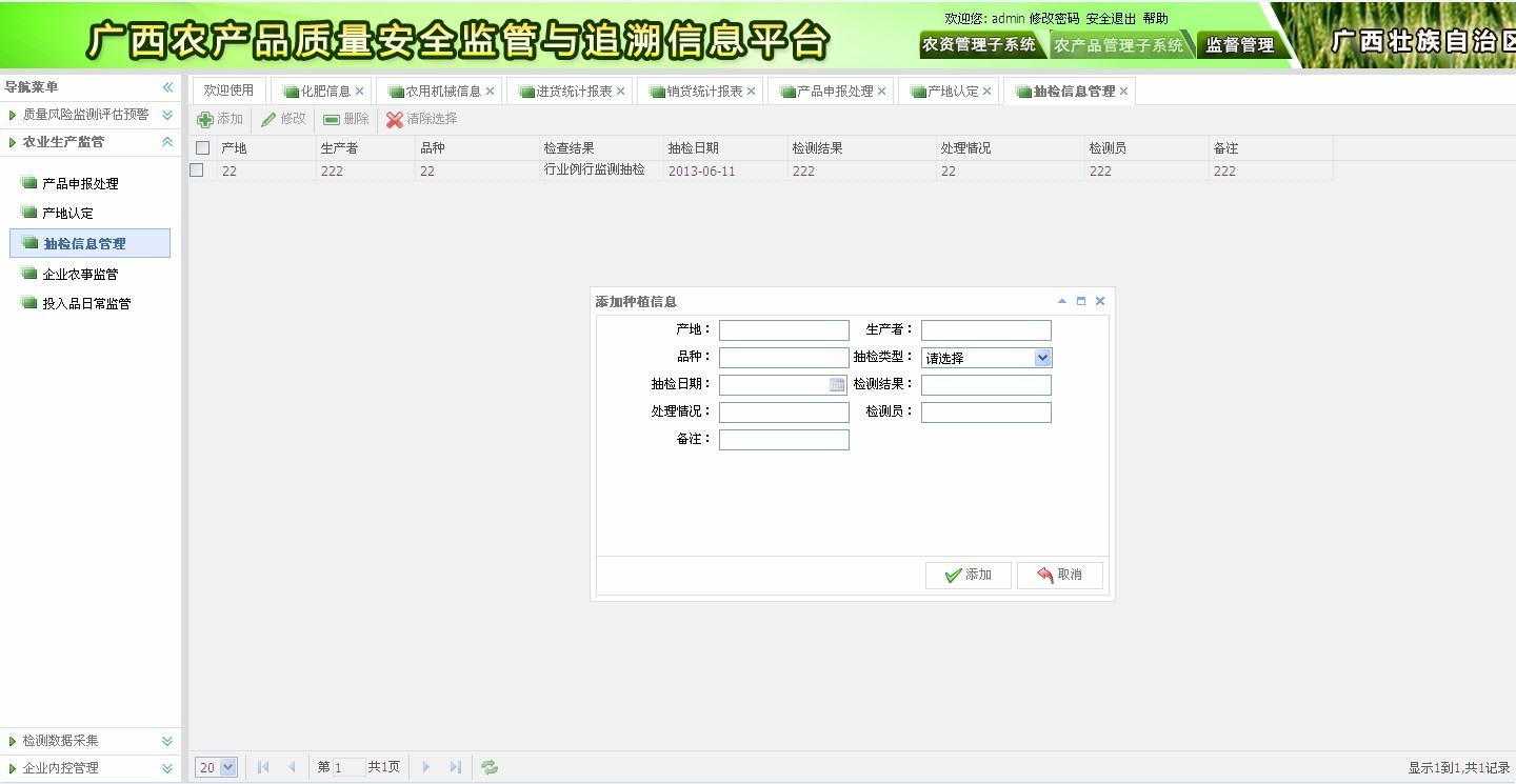 ? 抽檢信息管理:行業(yè)例行監(jiān)測抽檢,專項風險監(jiān)測,所含信息包括產地、生產者、品種、檢測結果、處理情況、檢測員等信息。如圖2-3所示