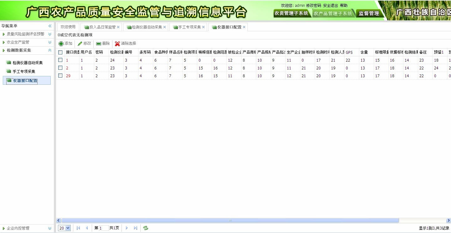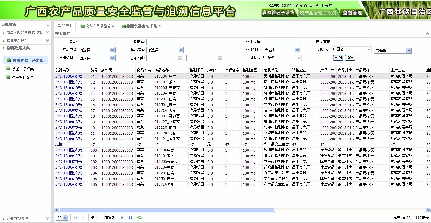 ? 系統(tǒng)跟儀器對接,傳輸檢測數(shù)據(jù)入庫。并能根據(jù)數(shù)據(jù)自動統(tǒng)計分析。支持多種類儀器,縱向支持區(qū)、市、縣、鄉(xiāng)農產品檢測監(jiān)控工作的資源共享,橫向預留與食品安全監(jiān)管部門數(shù)據(jù)共享接口。如圖3-1所示