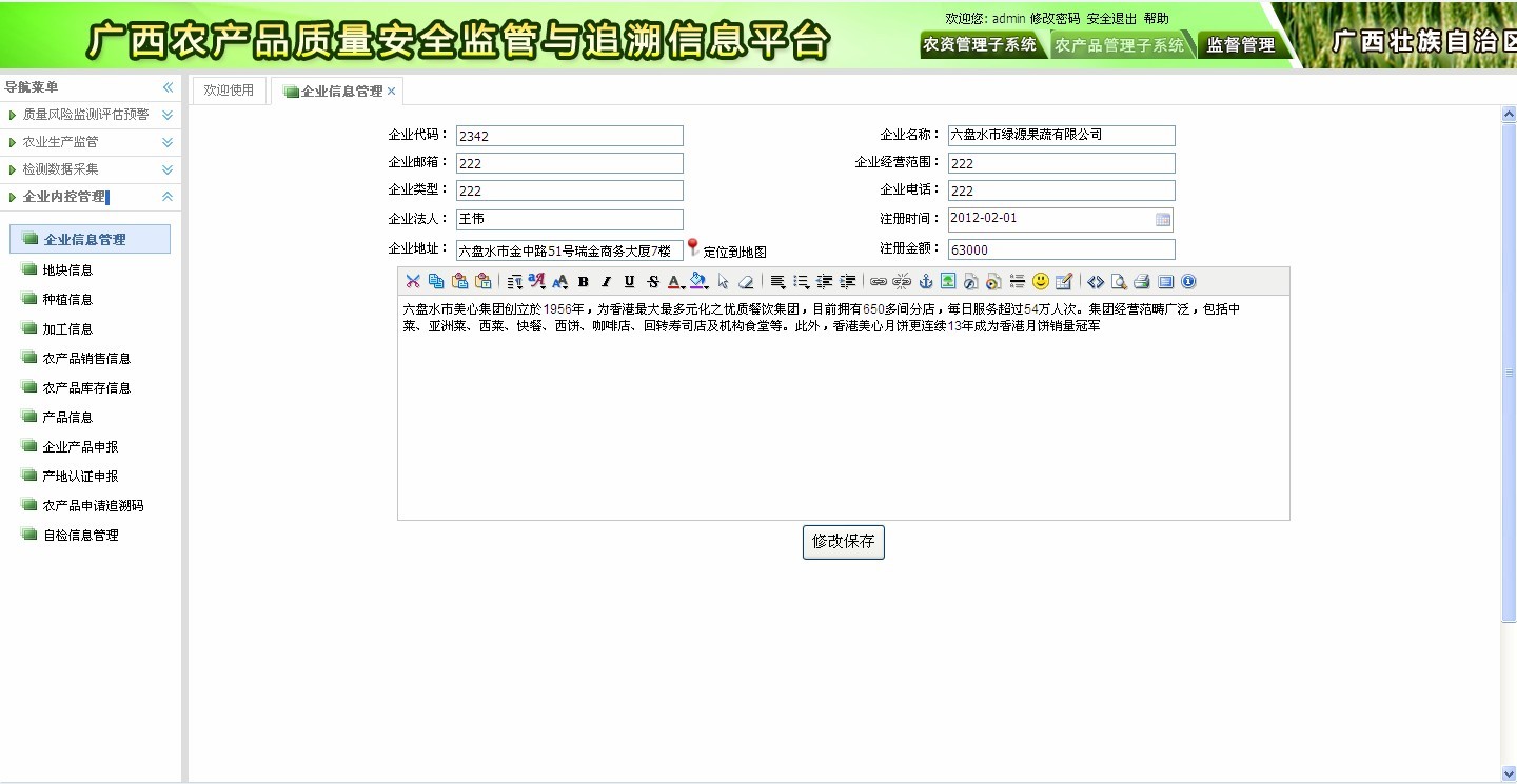 以農產品會員用戶登錄系統(tǒng),監(jiān)管企業(yè)的基礎信息,如有變動在此處修改,方便用戶的操作。如圖4-1所示
